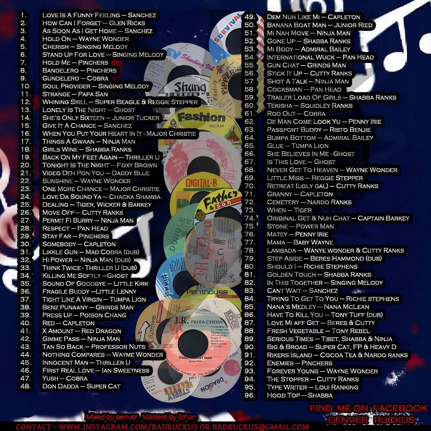"Intro" 01. Ruckus - Dancehall Flashback 1991 (Intro) 0:00 "Promised Land Riddim aka Love Fire Riddim" 02. Sanchez - Love Is A Funny Feeling 0:17 03. Glen Ricks - How Can I Forget 1:23 "Run Down The World Riddim" 04. Sanchez - As Soon As I Get Home 2:19 05. Wayne Wonder - Hold On 3:08 06. Singing Melody - Cherish 4:15 "Tempo Riddim" 07. Singing Melody - Stand Up For Love 5:12 "Storm Riddim aka Bandolero Riddim also typed Bandelero Riddim" 08. Pinchers - Hold Me 6:10 09. Pinchers - Bandelero 7:19 10. Mad Cobra - Gundelero 8:17 "DJ Drop" 11. Ruckus - DJ Drop 8:54 "Single" 12. Singing Melody - Soul Provider 9:05 "M-16 Riddim" 13. Papa San - Strange 10:11 "Wining Skill Riddim aka Come On Little Girl Riddim" 14. Super Beagle n Reggie Stepper - Whining Skill 11:37 "Singles" 15. Ghost - Lonely Is The Night 12:12 16. Junior Tucker - 16 (Into The Night) 13:04 "Things A Gwan Riddim" 17. Sanchez - Give It A Chance 13:47 18. Major Christie - When You Put Your Heart In It 14:45 19. Ninjaman - Things A Gwaan 15:52 20. Shabba Ranks - Girls Wine 16:38 "General Riddim aka Love Is Not A Gamble Riddim" 21. Thriller U - Back On My Feet Again 17:13 22. Foxy Brown - Tonight Is The Night 18:00 23. Daddy Blue - Video (Deh Pon You) 18:35 "Soap Riddim aka Power Play Riddim" 24. Wayne Wonder - Sunshine 19:10 25. Major Christie - One More Chance 20:16 26. Shacka Shamba - Luv Da Soun Ya Bad 20:49 27. Tiger, Wickerman n Captain Barkey - Dealing 21:20 28. Cutty Ranks - Move Off 21:53 29. Ninjaman - Permit To Burry 22:22 30. Pan Head - Gunman Tune (Respect) 23:26 "DJ Drop" 31. Ruckus Ft Pinchers - DJ Drop 24:31 "Mad Mad Riddim aka Diseases Riddim" 32. Pinchers - Stay Far 24:45 33. Capleton - Somebody 25:52 "Punaany Riddim" 34. Mad Cobra - Likkle Gun (Dub) 26:33 35. Ninjaman - Hi Power (Dub) 27:12 36. Thriller U - Think Twice (Dub) 28:01 37. Ghost - Killing Me Softly 29:22 38. Little Kirk - Sound Of Goodbye 29:52 39. Little Lenny - Fragile Buddy 30:36 40. Tumpa Lion - Tight Like A Virgin 30:57 41. Grindsman - Benz Punanny 31:37 "Press Up Riddim" 42. Poison Chang - Press Up 32:24 43. Johnny P - Look Good 33:03 "Mud Up Riddim aka Workie Workie Riddim" 44. Capleton - Red 33:19 45. Red Dragon - X Amount 33:56 46. Ninjaman - Gimme Pass 34:14 47. Professor Nuts - Tan So Back 34:40 "Mud Up Riddim aka Workie Workie Riddim aka Yush Riddim" 48. Wayne Wonder - Nothing Compares 35:29 49. Thriller U - Innocent Man 36:31 50. Ian Sweetness - My First Real Love 37:35 51. Mad Cobra - Yush 38:41 "No Warrior Riddim" 52. Super Cat - Don Dadda 39:14 "Governor Riddim" 53. Capleton - Dem Nuh Like Mi 40:19 "Koloko Riddim or Kolo-Ko Riddim" 54. Junior Reid - Banana Boat Man 41:07 "Single" 55. Ninjaman - Mi Nah Move 42:01 "Bully Beef Riddim" 56. Shabba Ranks - Gone Up 42:48 "Belly Bus Riddim" 57. Admiral Bailey - Mi Body 43:29 58. Pan Head - International Wuck 44:10 59. Grindsman - Gunchat 44:37 "Stick It Up Riddim" 60. Cutty Ranks - Stick It Up 45:30 "Poco Man Jam Riddim aka Dem Bow Riddim Segment With variant" 61. Ninjaman - Shot A Talk 46:00 62. Pan Head - Cocksman 46:44 63. Shabba Ranks - Trailer Load Of Girls 47:50 64. Squiddly Ranks - Teckisha 48:41 "PMJ aka DM aka Gum Riddim" 65. Mad Cobra - Rod Out 49:39 "PMJ aka DM" 66. Penny Irie - Go Look The Man 50:15 "PMJ aka DM aka Passport Buddy Riddim" 67. Risto Benjie - Passport Buddy 50:53 68. Admiral Bailey - Bumpa Bottom 51:41 "Singles" 69. Tumpa Lion - Pass Back Through (Glue) 52:12 70. Ghost - She Believes In Me (Kenny Rogers Cover) 52:39 "This Is Love Riddim" 71. Ghost - This Is Love 53:38 "PMJ Riddim aka DB Riddim aka More Poco Riddim aka Little Miss Riddim" 72. Wayne Wonder - Never Get To Heaven 54:33 73. Reggie Stepper - Little Miss 55:18 74. Cutty Ranks - Retreat (Ugly Gal) 56:01 75. Capleton - Granny 56:20 76. Nardo Ranks - Cemetery 57:35 "Worm Riddim" 77. Tiger - When 58:22 78. Captain Barkey - Original Get And No Get (Original Get n Nuh Chat) 59:04 "Giggy Riddim aka Mama Riddim" 79. Powerman - Stone 59:41 80. Penny Irie - Matey 1:00:16 81. Baby Wayne - Mama 1:01:04 "Lambada Riddim" 82. Wayne Wonder n Cutty Ranks - Lambada 1:01:48 "Drifter Riddim" 83. Beres Hammond - Step Aside (Dub) 1:03:20 84. Richie Stephens - Should I 1:04:20 "Golden Touch Riddim" 85. Shabba Ranks n ETC - Golden Touch 1:05:23 "Full Up Riddim aka Kutchie More Kutchie Riddim" 86. Singing Melody - In This Together 1:06:19 "A Love I Can Feel Riddim" 87. Sanchez - Can't Wait 1:06:58 88. Richie Stephens - Trying To Get To You 1:07:31 89. Nana McLean - Nana's Medley 1:08:20 90. Tony Tuff - I'll Have To Get You (Have To Kill You) (Dub) 1:09:16 91. Beres Hammond n Cutty Ranks - Love Me Have To Get (Love Me Haffi Get) 1:09:50 92. Tony Rebel - Fresh Vegetable 1:10:21 "Freedom Blues Riddim" 93. Admiral Tibet, Shabba Ranks n Ninjaman - Serious Times 1:10:54 "I'm In The Mood For Love Riddim" 94. Super Cat, Frankie Paul n Heavy D - Big And Broad (Big And Ready) 1:11:40 "Get In The Groove Riddim" 95. Cocoa Tea n Nardo Ranks - Rikers Island (Me No Like Rikers Island) 1:12:41 "Real Rock Riddim" 96. Pinchers - Enemies 1:13:161 97. Wayne Wonder - Forever Young 1:14:10 "Punaany Riddim" 98. Cutty Ranks - The Stopper 1:15:13 "Shank I Sheck Riddim" 99. Louie Rankin - Type Writer 1:15:56 "Wild Flower Riddim aka Nah Put It Down Riddim" 100. Shabba Ranks - Hood Top 1:16:56 101. Penny Irie - Shout It Out 1:17:37 "Outro" 102. Ruckus - Dancehall Flashback 1991 (Outro) 1:18:36 "Singles" 103. Carlene Davis - Dial My Number 1:18:45 "Mission Impossible Riddim aka House Call Riddim" 104. Maxi Priest n Shabba Ranks - House Call 1:19:19